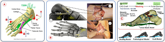 These were considered across three distinct models: a healthy model (preserves all foot structures and healthy mechanical properties of the native tissues, including the LS), a diseased model (mimics an injured LS scenario, does not consider the work carried out by the LS, other structures maintain their mechanical properties), and the grafted model (an iterative model of the three grafts, disregards the LS, other structures maintain their mechanical properties) (Figure 2C).