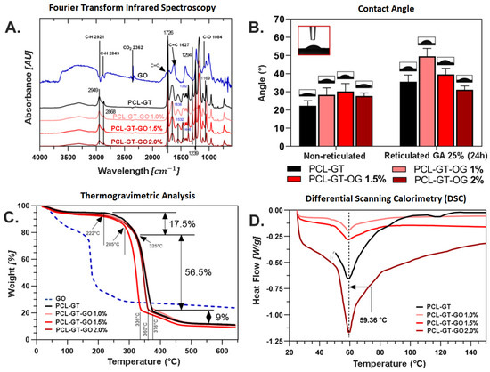 (A) Absorbance FTIR spectra for graphene oxide and electrospun grafts in each of their treatments and (B) evaluation of wettability in all electrospun membranes by means of contact angle test with deionized water and optical images associated with each graft. (C) Thermal analysis results TGA (0–650 °C). (D) Thermal analysis results DSC (25–400 °C) for all electrospun grafts.
