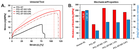 Figure 4A illustrates the mechanical properties of the grafts, including the modulus of elasticity and ultimate stress at break. The inclusion of GO across all grafts resulted in enhanced mechanical performance relative to samples comprising solely PCL and GT. The most significant improvement was observed in the PCL-GT-GO 1% graft, which displayed an ultimate tensile strength increase of 112% over the PCL-GT control.