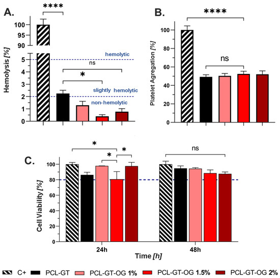 Biocompatibility results: (A) Hemolytic behavior, (B) platelet aggregation, and (C) cell viability for PCL-GT, PCL-GT-GO 1%, PCL-GT-GO 1.5%, and PCL-GT-GO 2%. The symbol * corresponds to a statistically significant difference with a p-value in the range of 0.01 ≤ p-value ≤ 0.05, **** to p-value < 0.0001.