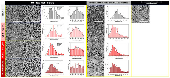 Measurement of nanofiber diameters after crosslinking from the surface morphology of electrospun membranes using SEM micrographs. From top to bottom, the order of grafts is PCL-GT, PCL-GT-GO 1.0%, PCL-GT-GO 1.5%, and PCL-GT-GO 2.0%. From left to right, the images show no treatment fibers (fiber diameter and fiber orientation angle), crosslinked and sterilized fibers, and crosslinked (fiber diameter), sterilized, and mechanically twisted fiber treatment (fiber orientation angle). Insert plots: histograms and Gaussian fit of fiber diameters.