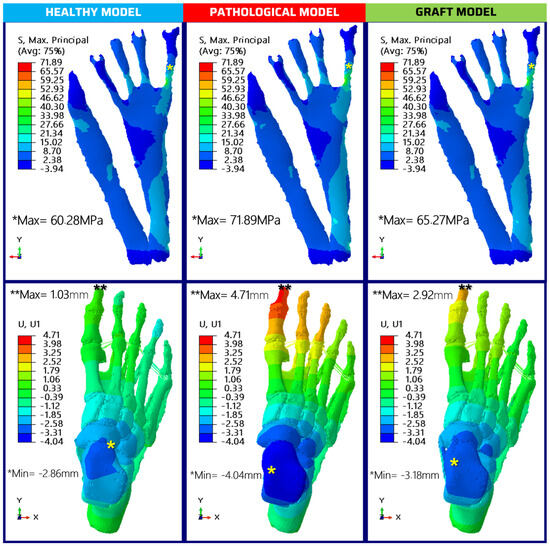 In the healthy foot model, the talus node experienced a displacement of −4.32 mm. By contrast, the model representing the diseased state exhibited a more pronounced collapse, with a 10% increase in displacement, measuring −4.75 mm. This metric clearly illustrates the mechanical compromise associated with AAFD. Yet when the model was adjusted to incorporate the proposed grafts, there was a notable correction in the pathological drop, with a reduction to −4.44 mm, indicating a 6% improvement.