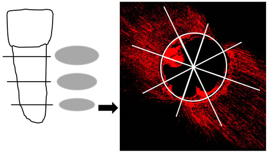 Each root underwent horizontal sectioning at three different distances from the apex: 4 mm, 8 mm, and 12 mm. An illustrative horizontal section obtained through CLSM is shown on the right. A total of 8 measurements were performed for each section, spaced at 45° intervals, as depicted in the accompanying pie chart.