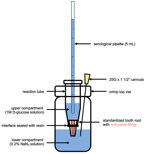 The coronal portion of each root was securely placed within an Eppendorf vial, which was trimmed at the apex and sealed with a temporary resin material (Luxatemp Automix plus, DMG, Hamburg, Germany). These Eppendorf vials, housing the roots, were then positioned within sterile crimp top vials containing 3.5 mL of H2O with 0.2% NaN3. The roots were arranged in a manner that the root tip came into contact with the aqueous solution. Serological pipettes were inserted into holes in the Eppendorf vials and filled with 5 mL of a 1 M aqueous solution of D-glucose, resulting in a hydrostatic pressure of 1.5 kPa on the experimental setup, which is shown in Figure 2. The entire assembly was relocated and maintained at a temperature of 37 °C and humidity level of 60% for a designated observation period of 30 days.