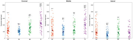Strip plot presenting the penetration depths (µm) of each sealer into the dentinal tubules of the apical, middle, and coronal sections of the root canals. p-values obtained with Kruskal–Wallis test and Dunn’s post hoc test with a Bonferroni correction. *, p < 0.05; **, p < 0.001.