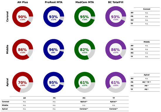 Average percentages of the circumference penetrated by the sealers in the apical, middle, and coronal regions of the root canals. Data shown as means and standard deviation. p-values obtained with Kruskal–Wallis test and Dunn’s post hoc test with a Bonferroni correction. *, p < 0.05; n.s., no significant differences.