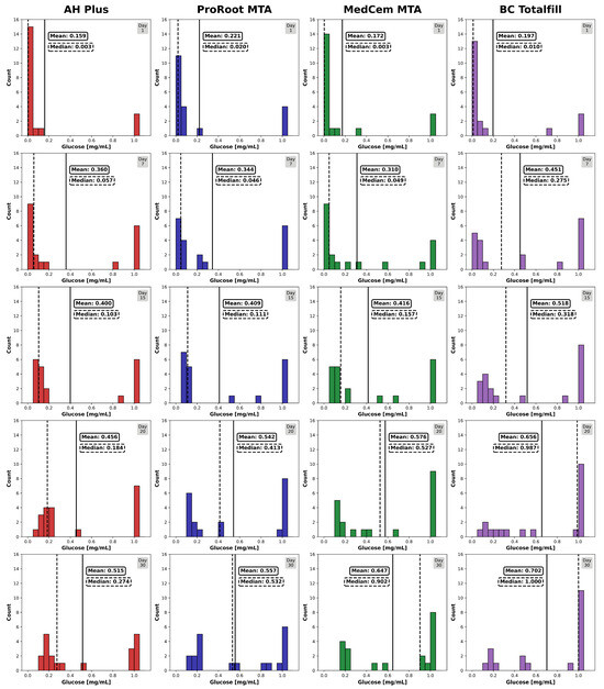 Glucose microleakage of root canal-treated teeth. Histograms represent the distribution of the glucose concentration (mg/mL) in the lower compartment for each day of measurement (n = 20 per group, binwidth = 0.05 mg/mL). The results for the different sealer groups are given from left to right. The change in glucose concentration over time (days 1, 7, 15, 20, and 30) is given from top to bottom for each group. The columns represent the number of specimens showing the specific glucose concentration. The vertical solid and plotted lines (black) give the mean and median concentration of penetrated glucose for each sealer group and time point.