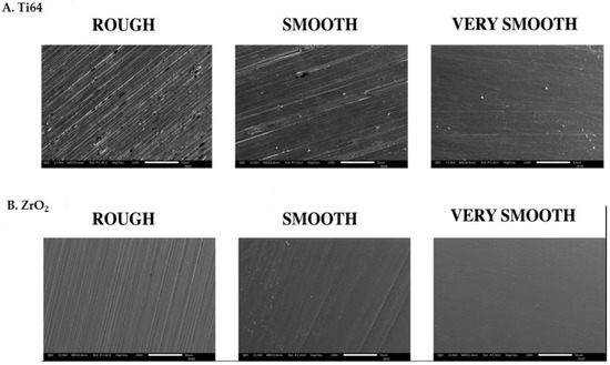 Our samples were designed using an open-source computer design software version 3.5 (Meshmixer, Autocad) and milled using a 5-axis milling machine (Ivoclar Programill PM3, Schaan, Liechtenstein). Zirconium oxide discs were sintered at 1600 °C for 2 h in the Programat 7 Furnace (Ivoclar Vivadent Pty Ltd., Liechtenstein, Germany). Different grades of roughness were prepared by sequential polishing routes, including diamond-impregnated burs and polishing with diamond paste. Our recently published article provides a detailed procedure for preparing Ti64 and ZrO2 surfaces [18]. Three levels of roughness were created for each TiO2 and ZrO2 sample: rough (R) with Ra ≥ 3 µm, smooth (S) with Ra ≥ 1 to 1.5 µm, and very smooth (VS) with Ra ≤ 0.1 µm [18,19]. The morphology of the surfaces was analysed using a scanning electron microscope JEOL IT-300 (Jeol Ltd., Tokyo, Japan) at an accelerating voltage of 15 kV with a stage at perpendicular orientation. Samples were submitted to gold sputtering. A profile from each surface topography was registered using a 3D optical profilometer Zeta 300 3D (KLA Ltd., Milpitas, CA, USA). Different roughness descriptors were measured using an ×10 lens under a 100 µm × 100 µm scanning area. We measured Ra in five different regions in each disc (right, left, centre, top, and bottom), each value being an average of five other different linear profiles. A Z range of 50 µm mode was chosen, and each sample was scanned three times at five different spots: the centre, 3 mm right, 3 mm left, 3 mm below, and 3 mm above from the centre area. Mean roughness (Ra), root means square roughness (Rq), and mean maximum height of the profile (Rz) were calculated based on eight different measurements in a scanned area using the built-in software.