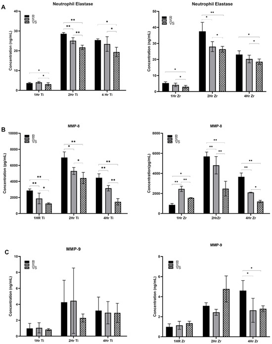 Neutrophil enzyme excretion between Ti64 (Ti) and ZrO2 (Zr) surfaces at 1 h, 2 h, and 4 h (A) Neutrophil elastase, (B) MMP-8, (C) MMP-9. * p ≤ 0.05; ** p ≤ 0.001.