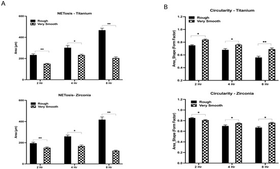 Comparison of (A) NET area formed and (B) NET circularity (shape) on rough and very smooth titanium (Ti64) VS zirconia (ZrO2) surfaces at 2 h, 4 h, and 8 h quantified using cell profiler software. * p ≤ 0.05; ** p ≤ 0.001.