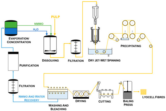 Production scheme of lyocell fibers [89] (reproduced with permission from Elsevier, Carbohydrate Polymers; published by Elsevier, 2021).