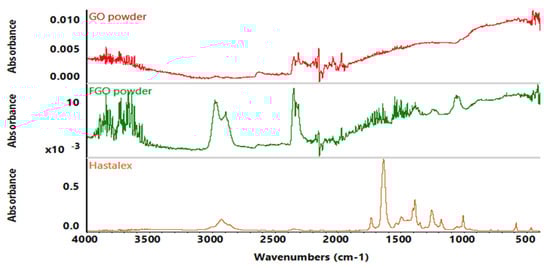 ATR-FTIR spectrum for GO and FGO powder and Hastalex. Spectrum analysis performed and peak 3000 cm−1 representing amine group functionalisation.