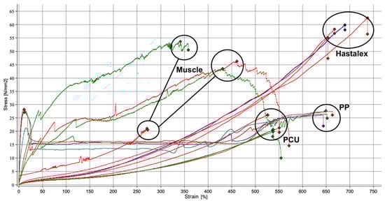 Tensile stress–strain graph of data from the tensile test on Hastalex; muscle tissue; PCU, poly(carbonate-urea)urethane; and PP, polypropylene.