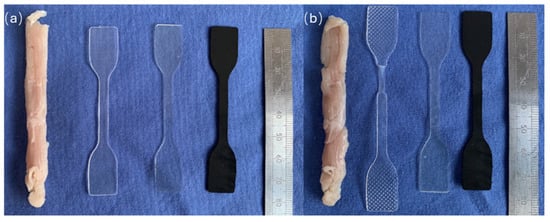 The mechanical properties of all the materials, Hastalex, PP, PCU, and the sheep muscle samples, were investigated via uniaxial tensile testing. A tensile tester (AML Instruments Ltd., Lincoln, UK) was equipped with the appropriate software (THSSD-2018) and used to characterise the mechanical properties of the aforementioned materials (n = 4 for all materials). The samples were cut into dog bone shapes with the main body dimensions of 4 mm × 30 mm, as per the ISO 527 [].