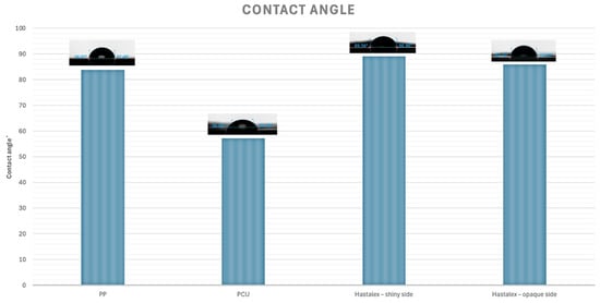 Bar chart demonstrating contact angles of materials under investigation. Contact angles were PP (83.8 ± 2.4°); PCU (57.2 ± 0.4°); Hastalex (shiny side 89.1 ± 0.9°; opaque side 85.9 ± 0.7°).