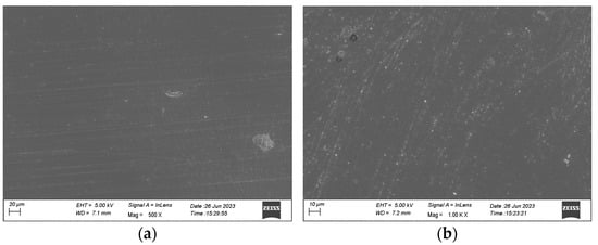 The surface topography of the samples was investigated using SEM, as described. The shiny side is seen in Figure 6a and the opaque side in Figure 6b. As expected, the opaque side shows more surface markings; however, both sides show a uniform surface with regular surface markings.