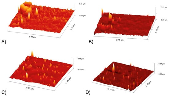 AFM images capturing surface nanotopography of AFM images of (A) PCU side in contact with glass during casting; (B) PCU side in contact with air during casting; (C) Hastalex side in contact with glass during casting; (D) Hastalex side in contact with air during casting.