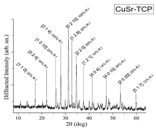 The XRD pattern of the CuSr-substituted TCP ceramic is shown in Figure 1.