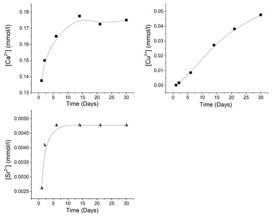 The cumulative release of Ca2+, Cu2+, and Sr2+ ions from CuSr TCP ceramics after soaking for 30 days in a 0.9% sodium chloride solution with the TRIS buffer is illustrated in Figure 2. Despite the possible binding of Cu2+ ions with TRIS, before determining the Cu2+ release in the solution, we treated the solution containing TRIS and copper ions with hydrochloric acid, which breaks down the copper complexes []. As can be seen from the obtained results, distinct release behaviors are observed for all detected ions. The concentration of Ca2+ reaches a plateau of approximately 0.175 mmol/L after 15 days of soaking. Conversely, the Cu2+ concentration exhibits an almost linear trend throughout the entire 30-day period, with the highest value of 0.048 mmol/L, while the Sr2+ concentration plateaus after 7 days, reaching a value of 0.00475 mmol/L.