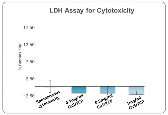 One of the fundamental assays commonly employed in standard cytotoxicity testing is the assessment of lactate dehydrogenase (LDH) release. LDH is a stable cytoplasmic enzyme present in all cells, and its release into the extracellular environment serves as a marker of cell membrane integrity []. When cells undergo damage or death, primarily through necrosis or late apoptosis, the compromised cell membrane allows LDH to leak into the surrounding culture medium. The quantification of the amount of LDH provides a reliable measure of cell death and membrane damage. In our study, media enriched with Sr, Cu-TCP in concentrations ranging from 0.1 mg/mL to 1 mg/mL did not show significant cell damage that would exceed 2% (Figure 3).