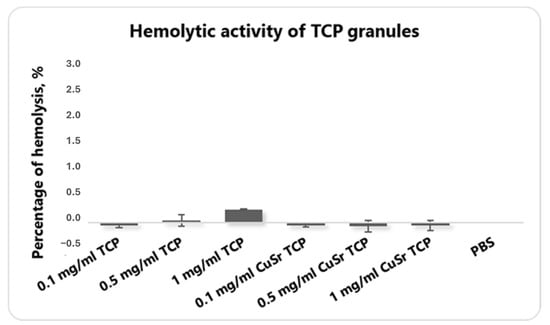 We previously reported the antimicrobial properties of double-substituted CuSr TCP powder, revealing a significant inhibition of microbial growth []. Specifically, CuSr TCP powder demonstrated a remarkable growth inhibition, reaching 92.0%, 95.5%, 64.9%, 96.3%, and 70.9% against Staphylococcus aureus, Pseudomonas aeruginosa, Escherichia coli, and Enterococcus faecalis bacteria strains and Candida albicans fungus, respectively, highlighting its potent effectiveness across a range of pathogenic microorganisms []. In the present study, we have assessed cytotoxicity, hemolytic properties, and osteogenic and angiogenic potentials of the CuSr TCP granules. During the studies, none of the concentrations revealed an adverse effect on cell viability that would exceed spontaneous cell death events. Another essential preliminary step in evaluating the biocompatibility of materials is an analysis of the hemolytic activity of TCP granules. This assay assesses the potential of the material to cause the destruction of red blood cells, which can lead to adverse biological responses if the material is incorporated into the body. The results from the hemolytic activity were promising, showing the hemolytic activity in a range of less than 2%, indicating that CuSr TCP granules exhibit low hemolytic potential.