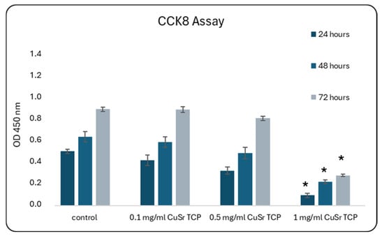 The next step in accessing the in vitro biocompatibility of double-ion-doped CuSr-TCP was aimed at elaborating the concentration of ceramic granules that would not affect cell growth. We assessed the proliferation of primary rat MSCs as a model of the bone progenitor cells during 72 h using the CCK8 (Sigma-Aldrich) assay. CCK8 is based on producing a water-soluble formazan dye when the tetrazolium salt, WST-8, is reduced by dehydrogenases in live cells. In our study, media enriched with 0.1 mg/mL and 0.5 mg/mL of CuSr TCP did not significantly affect cell growth and were comparable to the no-treatment control (Figure 5).