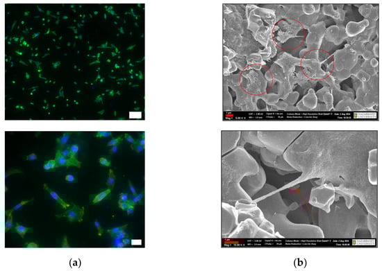 IFM images of BM-MSCs on the surface of CuSr TCP granules: (a) cells were seeded in a concentration of 1 × 104 cells per well, fixed, and double-stained with DAPI and phalloidin. Imaged with Zeiss Crossbeam 540 (Zeiss, Oberkochen, Germany), and scale bars are 100 µm for the upper and 20 µm for the lower image. (b) SEM images of BM-MSCs on the surface of CuSr TCP granules. Cells were seeded in a concentration of 1 × 104 cells per well, fixed, stained with 1 M Osmium Tetroxide, and covered with 20 nm gold. Scale bar: 1 µm.