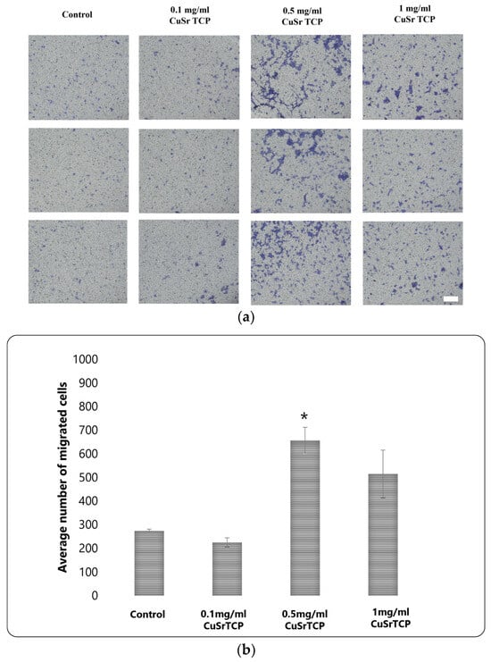 A Transwell migration assay provides valuable insights into how cells respond to environmental cues. BM-MSCs were cultured in CuSr TCP-enriched media (3-day extract) for 72 h, then were seeded in a density of 6 × 104 cells per well in 12-well plate inserts and allowed to migrate for 8 h, and then fixed, stained with Crystal Violet, and imaged under the microscope Axio Observer (Zeiss, Oberkochen, Germany) (Figure 7a). According to our data, media enriched with 0.1 mg/mL of granules did not significantly affect the migration ability of MSCs, while the cells in a group of 0.5 mg/mL CuSr TCP migrated more efficiently (2.5 times) than the control (Figure 7b). The excess ions released from the CuSr TCP granules could modify the biology of a cell, resulting in increased cell motility. Overall, it is a valuable tool in developing therapeutic strategies targeting cell migration and invasion.