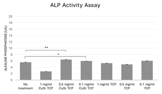 The alkaline phosphatase activity assay. hFOB1.19 cells were cultured in CuSr TCP- or TCP-enriched media (3-day extract) for 14 days. An Alkaline Phosphatase Assay Kit (ab83369, Abcam, Cambridge, UK) was used to assess the osteogenic differentiation. *—p value ≤ 0.05 compared to the no-treatment group, **—p value ≤ 0.005 compared to the no-treatment group.