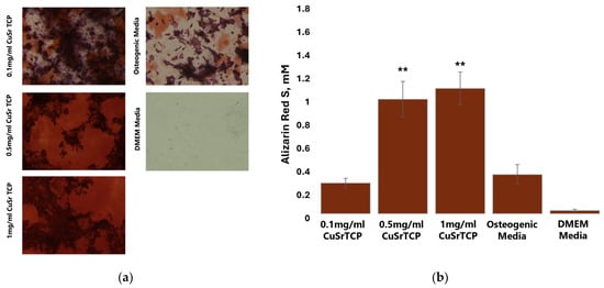 The Alizarin Red S Assay. BM-MSCs were cultured in CuSr TCP-enriched media (3-day extract) for 72 h. Alizarin Red S (A5533, Sigma Aldrich, St. Louis, MO, USA) was used to stain cells for osteogenic differentiation. (a) Microscopic images of osteogenic differentiation; (b) Quantitative analysis of osteogenic differentiation across the groups, **—p value ≤ 0.005 compared to the osteogenic media group (scale: 100 µm).