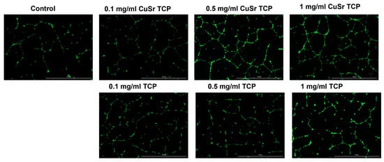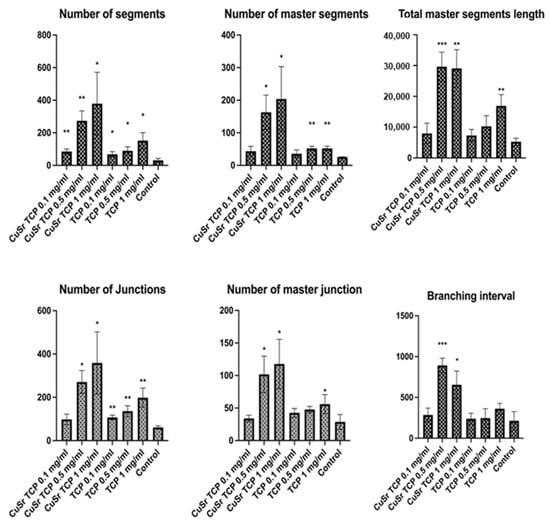 The influence of Sr- and Cu-substituted TCP on angiogenesis was investigated in human umbilical vein endothelial cells (HUVECs). Key parameters examined included the number of junctions, branches, master junctions, segments, master segments, total branching length, total branch length, branching interval, and total master segment length (Figure 10). Media enriched with CuSr TCP in concentrations of 0.5 mg/mL and 1 mg/mL showed the most prominent angiogenic effect. The number of segments in those groups was 8 and 12 times higher, respectively. The number of master segments and following segments’ length were subsequently increased. During the vessel development, cells form tubular structures and begin sprouting. The number of junctions is considered to be a measure of the sprouting. Both groups (0.5 and 1 mg/mL) showed a 4.5- and 6-fold increase in junctions, master junctions, and the branching interval compared to the control. The TCP-treated groups, while effective to some extent, do not reach the same level of effect as CuSr-treated groups. The results demonstrated that Sr and Cu substitutions in TCP particles significantly enhanced the measured angiogenic parameters compared to control and unsubstituted TCP granules. Furthermore, the angiogenic effects were concentration-dependent, with 0.5 mg/mL Cu-Sr-TCP showing better results than 0.1 mg/mL, and 1 mg/mL showing the most substantial improvements. Representative images were taken for each group to demonstrate the tube-like formations and sprouting (Figure 11).