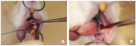 The intervention started with the induction of experimental periodontitis, by placing a cotton bandage around the lower left first molar of each animal. This aimed to facilitate the extraction of these teeth, since a decrease in the supporting bone helps to avoid apical root fracture and the need for more invasive tooth extraction techniques (Figure 1).