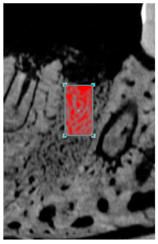 The images were reconstructed in the program Data Viewer (SkyScan, Version 1.4.4 64-bit) to adapt the standard positioning for all samples, enabling observation in three planes (transversal, longitudinal, and sagittal). Then, using CTAnalyser—CTAn (2003-11SkyScan, 2012 Bruker Micro-CT Version 1.12.4.0), the radiographic area of interest (ARI) was defined, delimited by an area of 4 mm3 that includes the portion of the tooth extraction site previously occupied by the mesial and distal roots of the lower left first molar and adjacent tissues. The CTAn software analyzed and measured the image according to gray scales. After adjusting and removing the grey shades from the corresponding area of the socket, the threshold used in the analysis was 49–95 gray shades, which made it possible to obtain the bone volume inside the sockets (Figure 2).