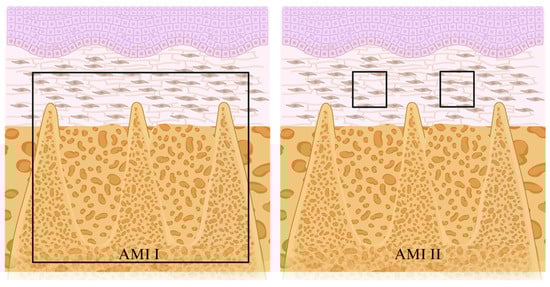 AMI (I) and AMI (II). The AMI (I) consisted of a 4 mm × 4 mm area that included the portion of the tooth extraction site previously occupied by the mesial and distal roots of the lower left first molar and adjacent tissues. The AMI (II) consisted of two areas of 250 × 250 μm located in the connective tissue covering the tooth extraction site.