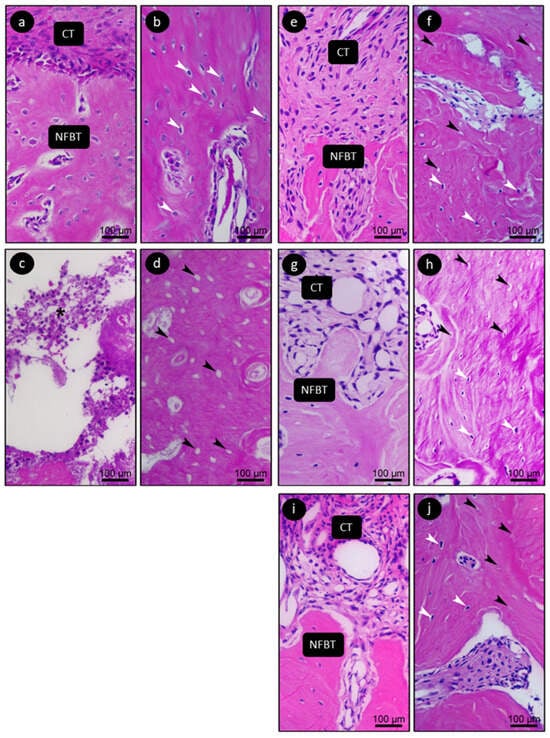 Histological appearance of the dental extraction site and surrounding areas, 28 days postoperatively. Photomicrograph showing the histological appearance of the bone tissue and connective tissue at the tooth extraction site 28 days postoperatively in groups (a) SAL, (c) ZOL, (e) ZOL+OZ500, (g) ZOL+OZ600, and (i) ZOL+OZ700. Photomicrograph showing the histological appearance of the bone tissue located in the immediate vicinity of the tooth extraction site 28 days postoperatively in groups (b) SAL, (d) ZOL, (f) ZOL+OZ500, (h) ZOL+OZ600, and (j) ZOL+OZ700. White arrows: osteocytes; ct: connective tissue; NFBT: neoformed bone tissue. Original magnification: 400×. Scale bars: 100 µm. Hematoxylin and eosin (HE) staining. The white arrows show the presence of osteocytes and the black arrows show the gaps of empty osteocytes.