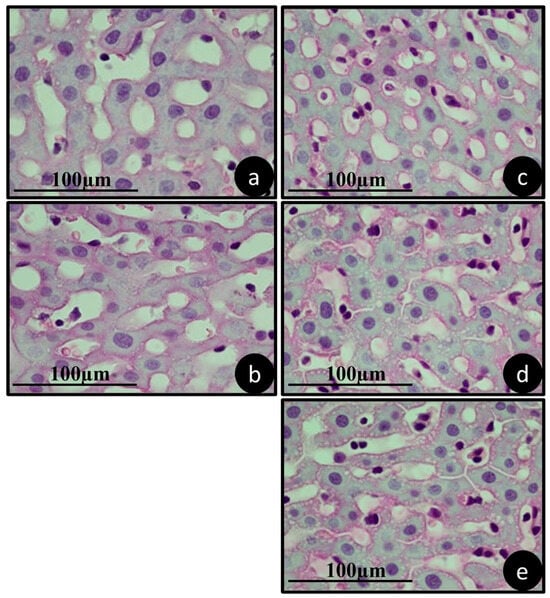 Representative histology of the livers of animals from groups (a) SAL, (b) ZOL, (c) ZOL+OZ500, (d) ZOL+OZ600, (e) ZOL+OZ700, collected during euthanasia 28 days after extraction of the first molars. HE stained, 1000× magnification, scale 100 µm.