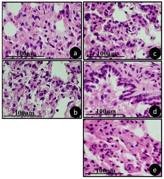 Representative lung histology of animals in groups (a) SAL, (b) ZOL, (c) ZOL+OZ500, (d) ZOL+OZ600, (e) ZOL+OZ700, collected during euthanasia 28 days after first molar extraction. HE stained, 1000× magnification, scale 100 µm.