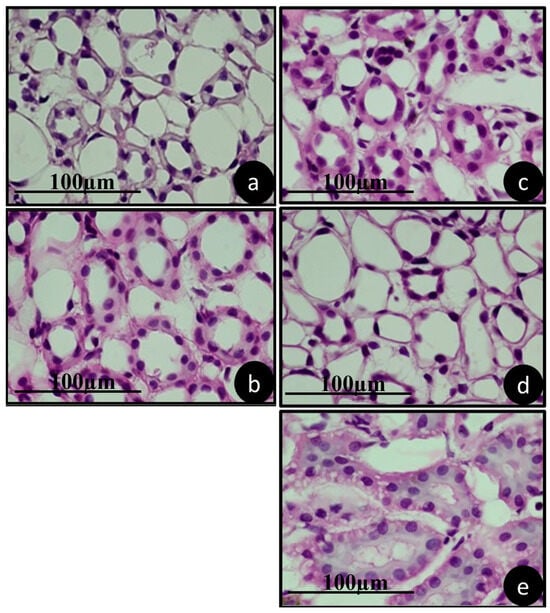 Representative kidney histology of animals in groups (a) SAL, (b) ZOL, (c) ZOL+OZ500, (d) ZOL+OZ600, (e) ZOL+OZ700, collected during euthanasia 28 days after first molar extraction. HE stained, 1000× magnification, scale 100 µm.