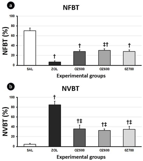 (a) Percentage of NFBT and (b) non-vital bone tissue (NVBT) at the tooth extraction site 28 days post-extraction. Statistical tests: Kruskal–Wallis analysis of variance and Student–Newman–Keuls post hoc test. †: statistically significant difference in relation to the SAL group; ‡: statistically significant difference in relation to the ZOL group.