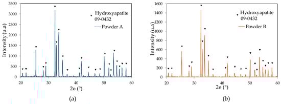 Powder composition determined by X-ray diffractometry (XRD). Representative XRD curve for (a) powder A and (b) powder B.