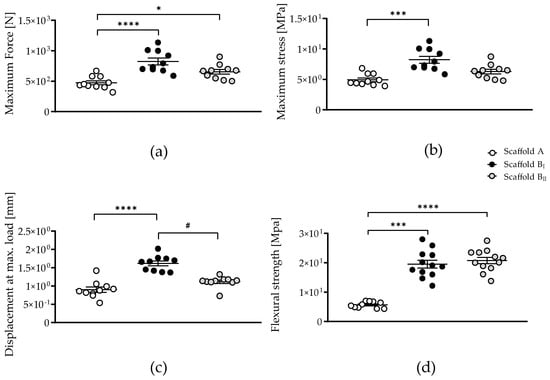 Mechanical characterization of the three scaffolds tested. (a) Maximum force, (b) maximum stress, (c) displacements at maximum load, and (d) flexural strength were analyzed on scaffolds generated with powder A sintering at 1230 °C [Scaffold A] or powder B sintering at 1250 °C and 1210 °C [scaffolds BI and BII, respectively]. The data are presented as the mean, standard error of the mean, and all data points. Data were analyzed by the Kruskal–Wallis test followed by Dunn’s multiple comparisons. p-values are classified as * p < 0.05; *** p < 0.001; and **** p < 0.0001 for comparison between scaffold B and scaffold A and as # p < 0.05 for comparison within scaffold B.