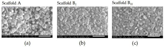 SEM images exhibited an irregular microtopography with several micropores and heterogeneous surfaces for all scaffolds (Figure 4). Scaffold A had bigger micropores and a rougher surface compared to scaffolds prepared with powder B (Figure 4a). Scaffold BII had more micropores than scaffold BI (Figure 4b,c).