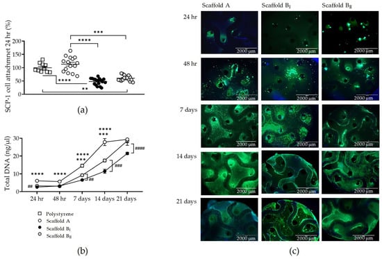 SCP-1 cell attachment, number of live cells, and proliferation on three scaffolds tested. SCP-1 cells were seeded and cultured on scaffolds A, BI, and BII for 21 days. (a) Attached SCP-1 cells on scaffolds compared to cultured polystyrene. Number of live SCP-1 cells were analyzed after 24 h, 48 h, 7 days, 14 days, and 21 days by total DNA levels (b) and visualized by esterase activity (c) using calcein-AM (green) and nuclear staining using Hoechst 33342 (blue) (scale bar 2000 µm). Each measure was conducted at least three independent times in triplicate. The data are presented as the mean, standard error of the mean, and all data points. Data were analyzed by the Kruskal–Wallis test followed by Dunn’s multiple comparisons (a) or a two-way analysis of variance test followed by Tukey’s multiple comparisons (b). p-values are classified as ** p < 0.01; *** p < 0.001; and **** p < 0.0001 for comparison between scaffold B and scaffold A and as ## p < 0.01; ### p < 0.001; and #### p < 0.0001 for comparison within scaffold B.
