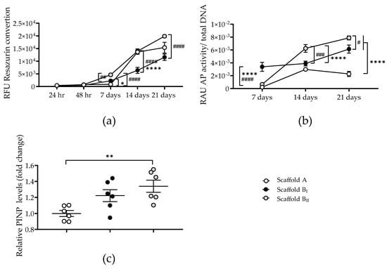 SCP-1 osteogenic differentiation potential on three scaffolds tested. SCP-1 cells were seeded and cultured under osteogenic condition on scaffolds A, BI, and BII for 21 days. (a) Metabolic activity of SCP-1 cells were analyzed after 24 h, 48 h, 7 days, 14 days, and 21 days by mitochondrial activity as relative fluorescence units (RFU). (b) Alkaline phosphatase (AP) activity normalized to DNA of SCP-1 cells were analyzed after 7 days, 14 days, and 21 days as relative absorbance units (RAU). (c) Procollagen type I N-propeptide (PINP) supernatant levels were determined after 21-day osteogenic culture. Each measure was conducted at least three independent times in duplicate. The data are presented as the mean, standard error of the mean, and all data points. Data were analyzed by a two-way analysis of variance test followed by Tukey’s multiple comparisons. p-values are classified as * p < 0.05; ** p < 0.01; and **** p < 0.0001 for comparison between scaffold B and scaffold A and as # p < 0.05; ## p < 0.01; ### p < 0.001; and #### p < 0.0001 for comparison within scaffold B.