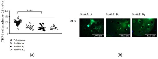 THP-1 cell attachment and number of live cells on three scaffolds tested. THP-1 cells were seeded and cultured on scaffolds A, BI, and BII for 24 h. (a) Attached SCP-1 cells on scaffolds compared to cultured polystyrene. Number of live THP-1 cells were visualized after 24 h by esterase activity (b) using calcein-AM (green) and nuclear staining using Hoechst 33342 (blue) (scale bar 2000 µm). Each measure was conducted at least three independent times in triplicate. The data are presented as the mean, standard error of the mean, and all data points. Data were analyzed by the Kruskal–Wallis test followed by Dunn’s multiple comparisons. p-values are classified as **** p < 0.0001 for comparison between scaffold B and scaffold A.