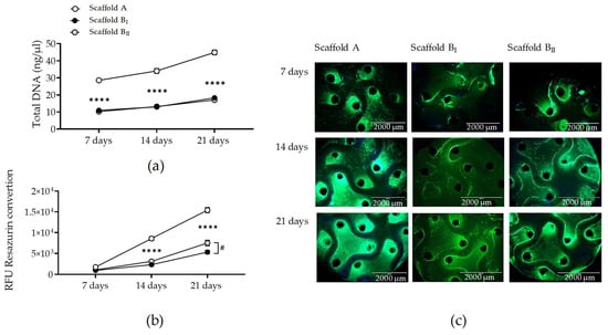 Bone cell viability and proliferation in co-cultures on the three scaffolds tested. THP-1 and SCP-1 were seeded and co-cultured on scaffolds A, BI, and BII for 21 days. Quantification of total DNA (a) and mitochondrial activity by resazurin conversion (b) in bone co-cultures after 7 days, 14 days, and 21 days. Number of live bone co-cultures were visualized by esterase activity (c) using calcein-AM (green) and nuclear staining with Hoechst 33342 (blue) (scale bar 2000 µm). Each measure was conducted at least three independent times in triplicate. The data are presented as the mean, standard error of the mean, and all data points. Data were analyzed by two-way analysis of variance test followed by Tukey’s multiple comparisons. p-values are classified as **** p < 0.0001 for comparison between scaffold B and scaffold A and as # p < 0.05 for comparison within scaffold B.