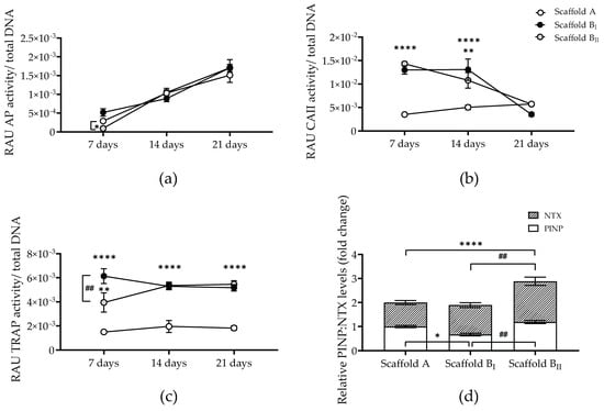 Osteoblast- and osteoclast-like cell function in co-cultures on the three scaffolds tested. THP-1 and SCP-1 were seeded and co-cultured on scaffolds A, BI, and BII for 21 days. (a) Alkaline phosphatase (AP), (b) carbonic anhydrase II (CAII), and (c) tartrate-resistant acid phosphatase (TRAP) activity normalized to DNA of bone co-cultures were analyzed after 7 days, 14 days, and 21 days as relative absorbance units (RAU). (d) Procollagen type I N-propeptide (PINP) and collagen type I N-telopeptide (NTX) supernatant levels were determined after a 21-day culture. Each measure was conducted at least three independent times in duplicate. The data are presented as the mean or standard error of the mean. Data were analyzed by a two-way analysis of variance test followed by Tukey’s multiple comparisons. p-values are classified as **** p < 0.0001, ** p < 0.01, and * p < 0.05 for comparison between scaffold B and scaffold A and as ## p < 0.01 for comparison within scaffold B.