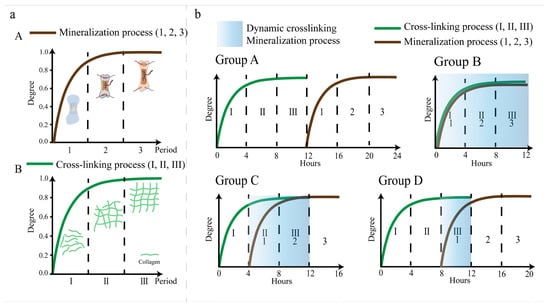 A schematic diagram of the collagen cross-linking and mineralization processes. (a) The mineralization process of natural bone is non-linear and can be divided into three stages (A) []. The cross-linking process of natural bone is also a nonlinear process in three stages (B). (b) Four sets of experiments were set up to explore the effect of dynamic cross-linking on mineralization. Group A was fully cross-linked for 12 h and mineralized for 12 h. Group B involved cross-linked mineralization that was simultaneously carried out for 12 h. Group C involved cross-linking for 4 h and then cross-linked mineralization for 12 h. Group D involved cross-linking for 8 h and then cross-linked mineralization for 12 h.