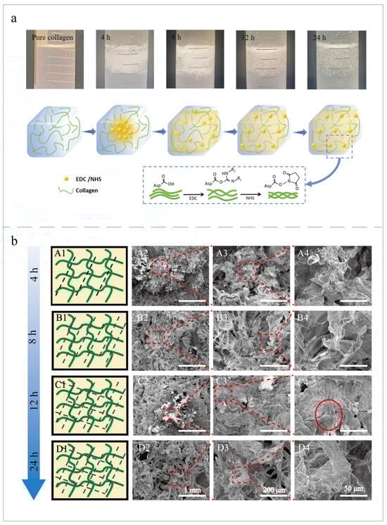 The morphology of the pure collagen and collagen at 4 h, 8 h, 12 h, and 24 h cross-linking times. (a) The macroscopic morphology of the cross-linked collagen and a schematic diagram of the diffusion process of the cross-linker. The block diagram is a schematic diagram of the principles of the EDC-/NHS-cross-linked collagen. (b) SEM images of the cross-linked collagen at the 1 mm (×100), 200 μm (×500), and 50 μm (×1500) scales. The red dashed boxes represent areas of the image that have increased magnification. (A1–D1) show collagen cross-linking diagrams. The green curve indicates the collagen fibers, and the black dashed line indicates the degree of cross-linking. The degree of cross-linking increased with increases in time. (A1–A4) show the cross-linking collagen for 4 h. (B1–B4) show the cross-linking collagen for 8 h. (C1–C4) show the cross-linking collagen for 12 h. The fibers had a smooth surface (C4, circle). (D1–D4) shows the cross-linking collagen for 24 h.