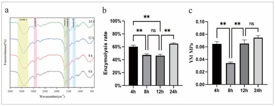 (a) The FTIR of collagen at 4 h, 8 h, 12 h, and 24 h cross-linking times. (b) The enzymolysis rate of collagen at 4 h, 8 h, 12 h, and 24 h cross-linking times. (c) The Young’s modulus of collagen at 4 h, 8 h, 12 h, and 24 h cross-linking times. ** p < 0.01, ns: no significant difference.